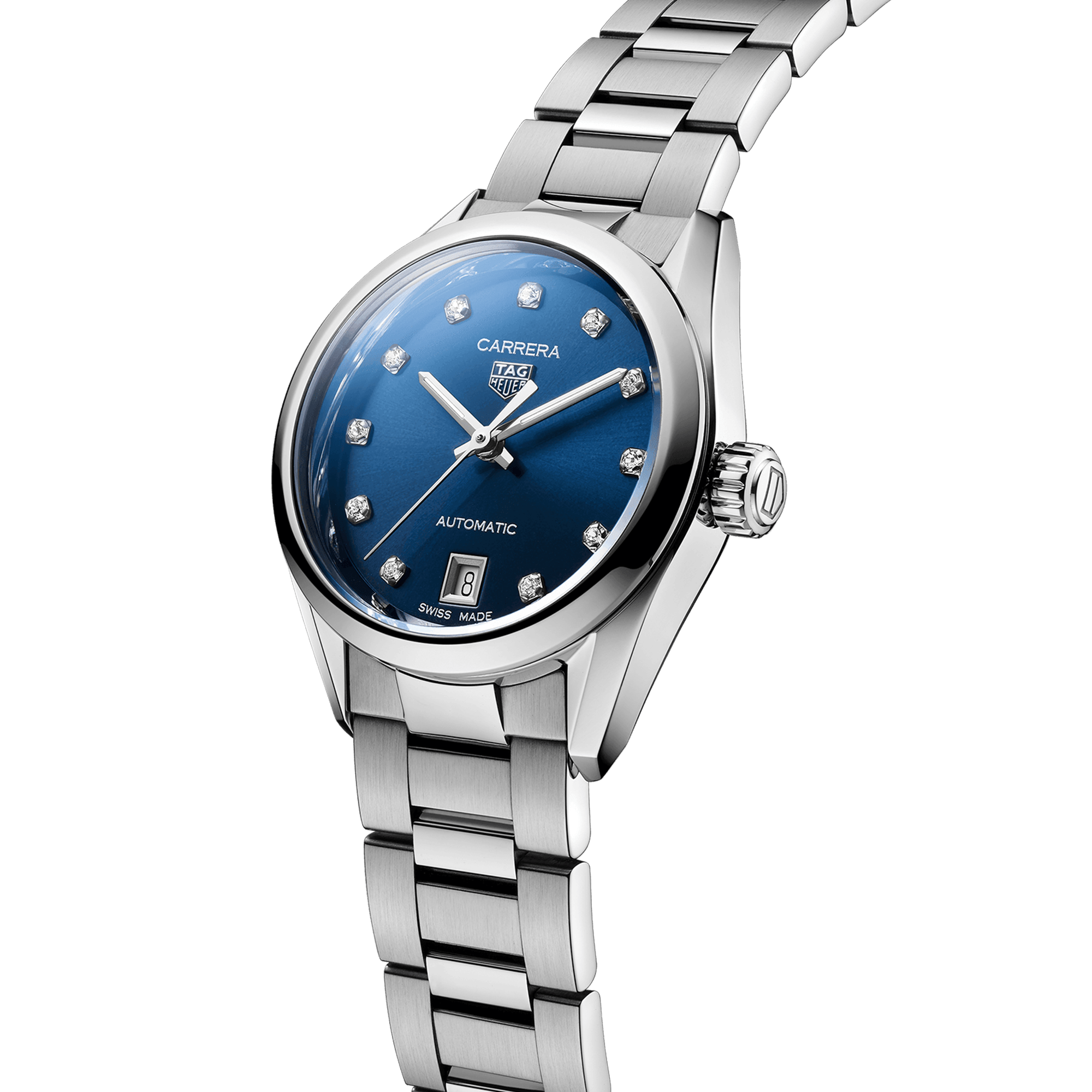 Ambitious and daring, this TAG Heuer Carrera automatic watch is a distinctive revealer of one’s personality. The striking luxury of the confident blue sunray dial is complemented by the dazzling diamond hour markers, a thrilling statement.