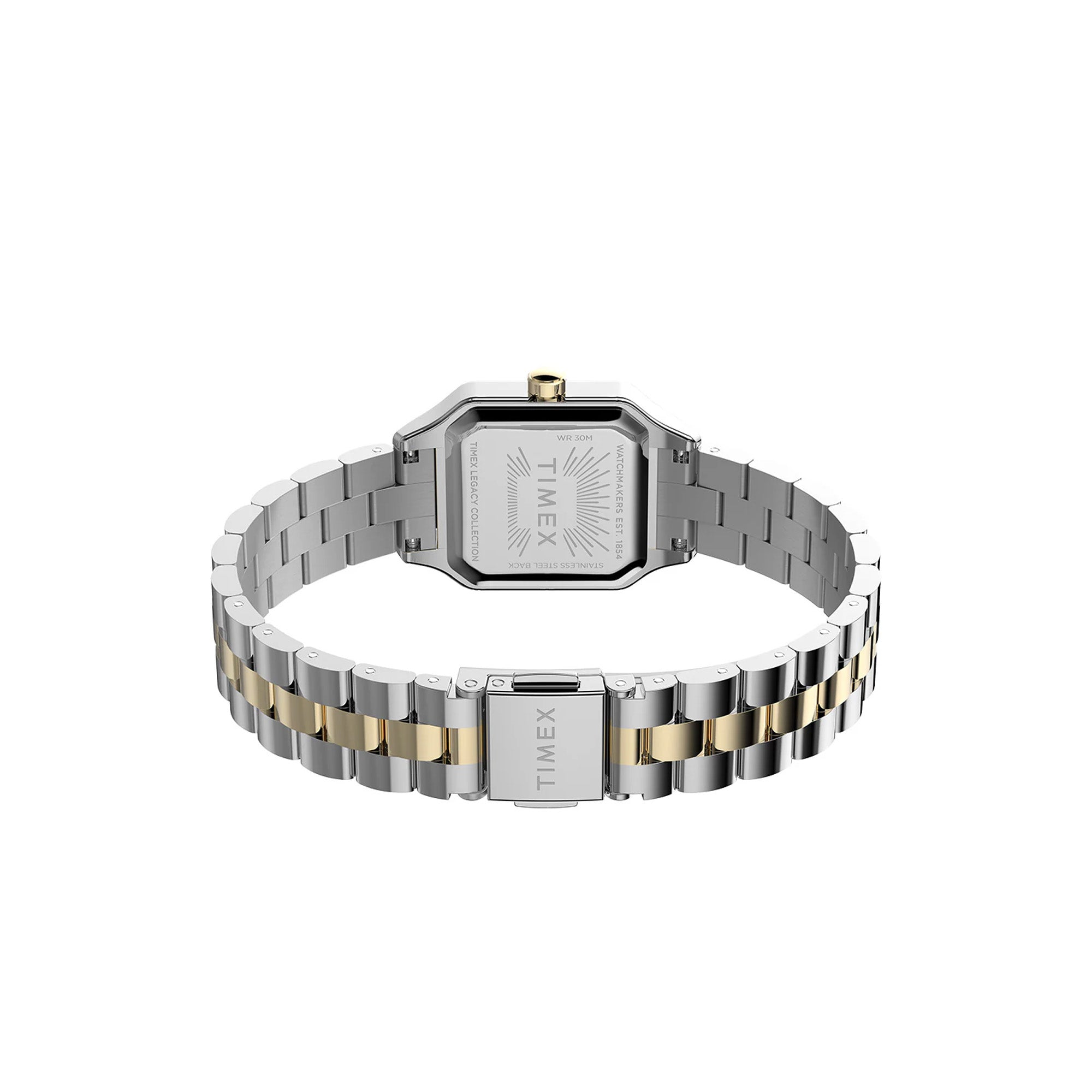 The Timex Legacy Addison Trend women’s watch pairs a distinctive square silhouette with a luminous silver-tone dial, where bold Roman numerals lend a sense of enduring sophistication. A two-tone stainless steel bracelet, combining polished silver with warm gold accents, offers versatile elegance that moves effortlessly from daytime styling to evening wear. The gold-tone bezel and crown complete the refined aesthetic, highlighting the watch’s thoughtful detailing.