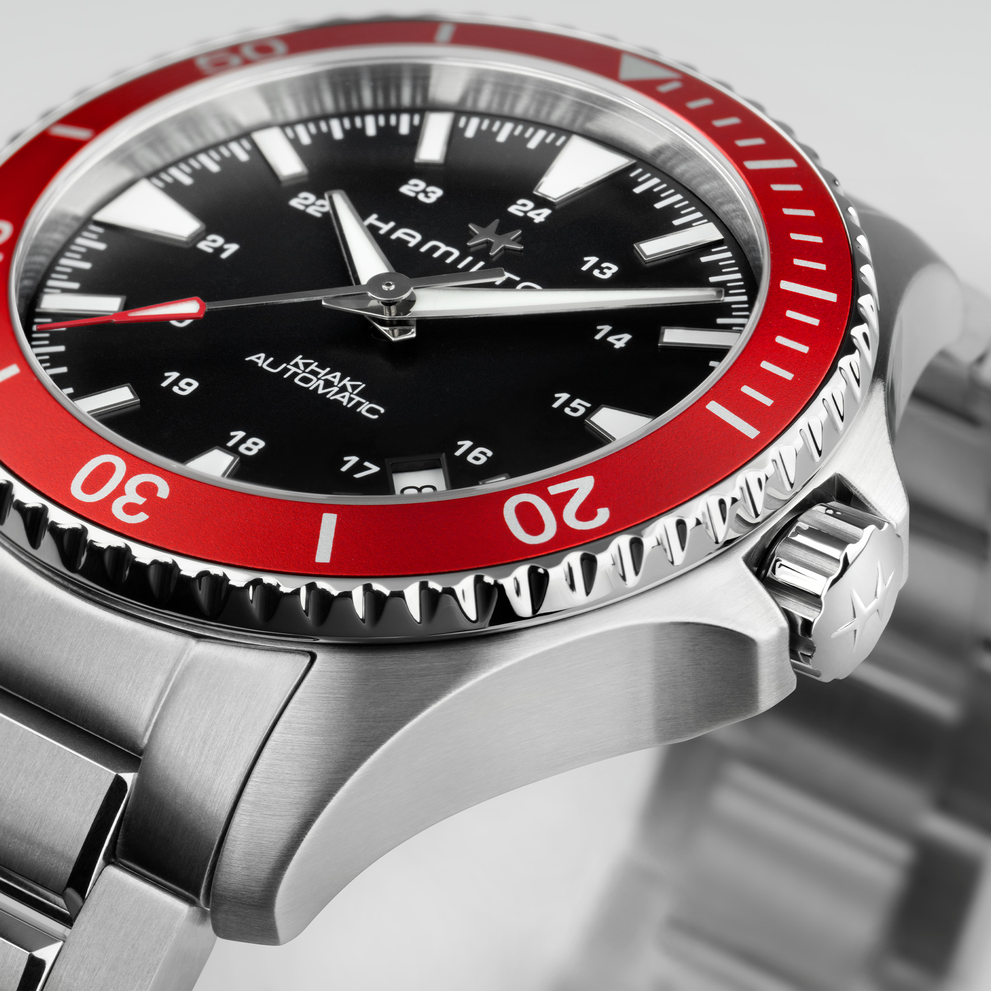The 40mm Khaki Navy Scuba Automatic features a red aluminum bezel with a sandblasted finish, for a softer, deeper tone and muted shine. Inspired by the marine universe, bright red is reminiscent of flaming red ocean rescue teams and the left side of sailing boats (portside). Powered by our H-10 automatic movement, this timepiece is the perfect choice for those who appreciate both style and performance. Appealing and ubiquitous, the red colorway adds a unique edge to the Khaki Navy Scuba, making it a timeless companion for any challenge, from aquatic explorations to urban adventures.